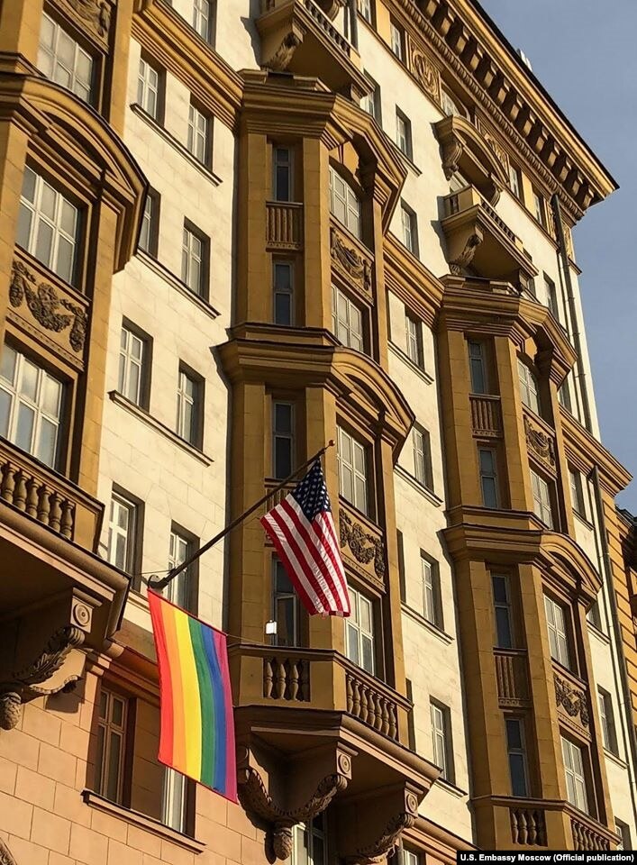 Посольство США в Москве разместило на фасаде своего здания радужный флаг. В сообщении дипмиссии говорится, что так чествуется флаг гордости ЛГБТИ во время празднования Дня радужного флага.