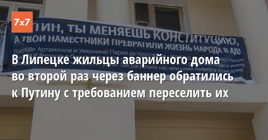 В Липецке жители аварийного дома №151–153 по улице Гагарина во второй раз разместили на фасаде здания баннер с требованием к губернатору Игорю Артамонову и мэру Евгении Уваркиной переселить их или поселиться в нем самим. Баннер повесили на втором этаже здания, потому что прошлый с первого этажа сорвали через полчаса. Об этом «7х7» сообщил член инициативной группы жителей дома Юрий Торпов.
