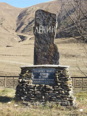 © Fred Wuir (публикуется с любезного разрешения автора) Редкий пример сохранившегося раннего памятника (Осетия). Табличка утверждает, что камень был поставлен прямо в день смерти Ленина, — хотя сама табличка, вероятно, установлена позже Уже к 30-м годам скульптурный образ вождя был монополизирован государством. Ленин, отец пролетарской нации, получил статус вечно живого; было утверждено несколько канонических скульптурных образцов, которые украшали центральные площади советских городов. Алексей Ханютин называет такой памятник «кафедральным»: в государственные праздники именно здесь проходили официальные мероприятия, звучали торжественные речи и совершался «ритуал самопрезентации власти» [5].