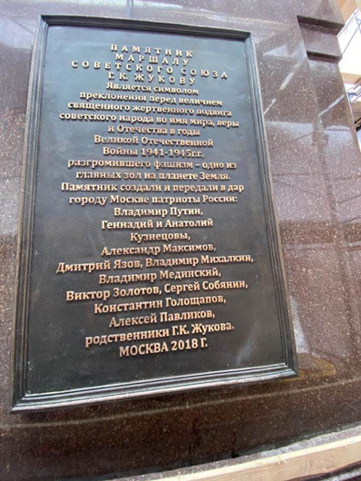 Список патриотов открывался Путиным и включал 10 имен высокопоставленных официальных лиц и других людей, неизвестных широкой общественности. На табличке была выбита дата — 2018 год: то есть переосмысление памятника Жукову кем-то задумывалось как минимум за два года до того, как был осуществлен скандальный демонтаж [13]. На следующий день место, где раньше стоял Жуков, было плотно закрыто тканью с изображением прежнего памятника и окружено двойным ограждением. Московские власти, для которых вся история с Жуковым, очевидно, оказалась полной неожиданностью, заявили, что старый памятник будет возвращен на свое место «после реставрации». И спустя месяц старый памятник действительно вернулся, но так и осталось загадкой, кто и как сумел доставить тяжелую технику на строжайше охраняемую Федеральной службой охраны территорию в самом центре Москвы и на каком основании осуществил в обход официальных инстанций демонтаж монумента. Это невероятное происшествие показывает, каким хрупким может быть бронзовый символ. С символической точки зрения стремительная и тайная подмена начисто лишала бы памятник Жукову того смысла, которым он был наделен последние двадцать пять лет. Скульптурная фигура маршала с новой табличкой — уже не государственная дань памяти творцу Победы. В такой инкарнации Победа оказывалась бы собственностью Путина с группой патриотов, подарком Москве от щедрот верховного правителя.