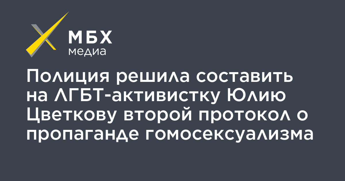 Полиция решила составить второй административный протокол о пропаганде гомосексуализма среди несовершеннолетних на ЛГБТ-активистку Юлию Цветкову из-за картинки во «ВКонтакте» с надписью «Семья там, где любовь. Поддержите ЛГБТ+ семьи». Об этом Цветкова сообщила «МБХ медиа».