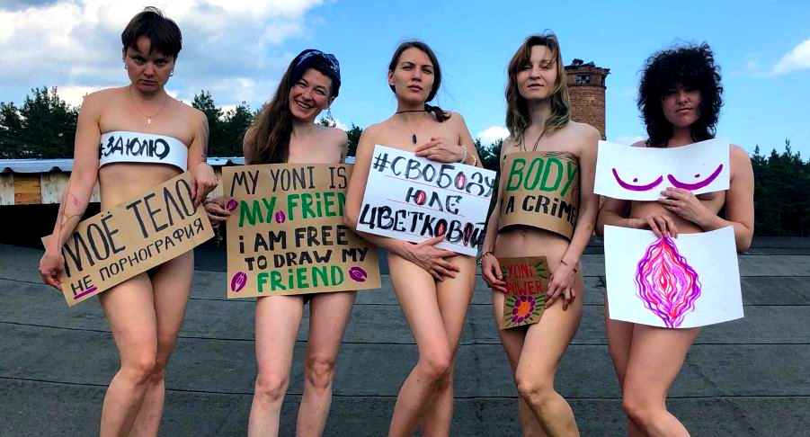 «Мы хотим высказаться в защиту молодой художницы из Комсомольска-на-Амуре Юлии Цветковой , обвиняемой в распространении порнографии и пропаганде гомосексуальных отношений. Юлии грозит до 6 лет тюрьмы за схематичные бодипозитивные изображения женских тел и ведение вк-паблика “Монологи вагины”. 11 февраля 2020 года правозащитная организация «Мемориал» признала Юлию политзаключенной. 16 апреля Юлия получила международную награду «Index on Censorship» в номинации «Искусство», став второй россиянкой после Анны Политковской.