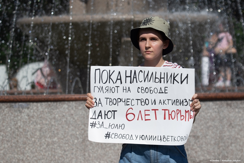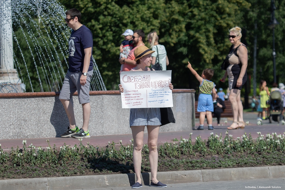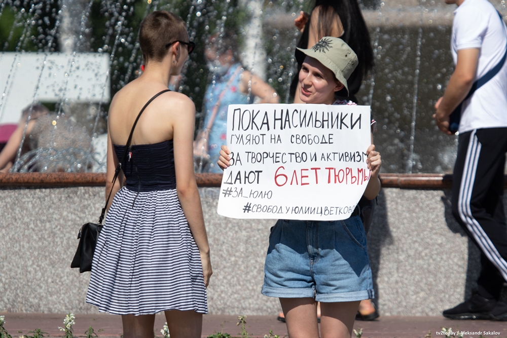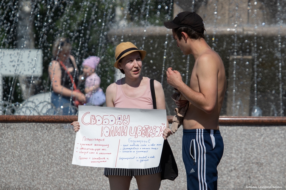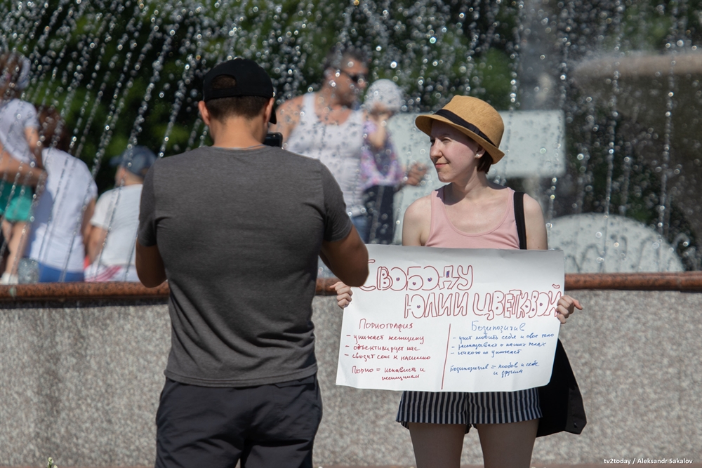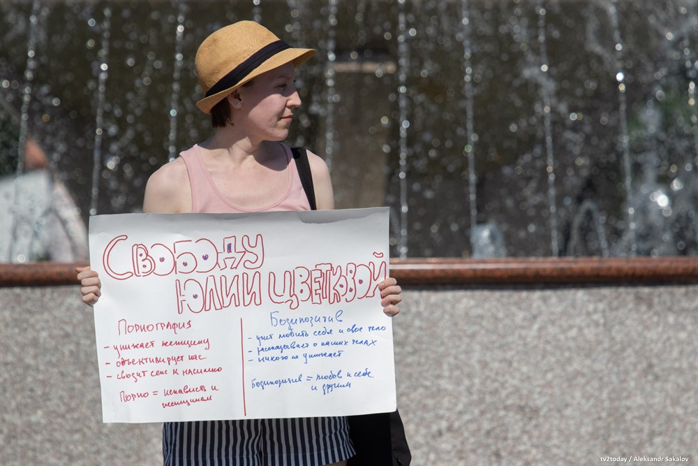 В Томске прошли одиночные пикеты в поддержку фемактивистки из Комсомольска-на-Амуре Юлии Цветковой, которой предъявили обвинение в распространении порнографии. Девушке грозит до шести лет лишения свободы.