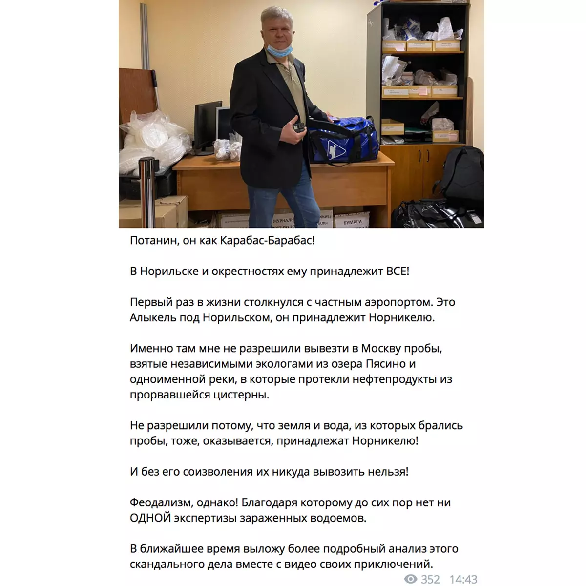 Пробы из озера Пясина пытался отправить в Москву и депутат Мосгордумы Сергей Митрохин — ему их передали журналисты «Новой газеты». Вывезти их не разрешили сотрудники норильского аэропорта: они сказали, что без согласия «Норникеля» делать этого нельзя. В итоге один из участников экспедиции даже отказался от вылета в Москву и забрал с собой пробы.