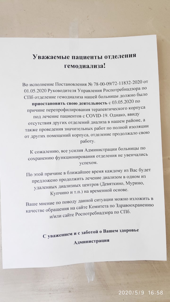 По распоряжению Роспотребнадзора, 15-я городская больница была перепрофилирована для приема больных с коронавирусной инфекцией. Как только пациенты отделения гемодиализа узнали, что им предстоит перевод в другие диализные центры, они сразу написали коллективное письмо в комитет по здравоохранению, в Роспотребнадзор, в Администрацию президента и в другие инстанции, указывая, что в 15-й больнице почему-то остаются работать другие отделения, которые не назовешь жизненно важными, и прося не закрывать отделение гемодиализа. "Принято решение, которое ставит гемодиализных больных в невыносимое положение, происходит нарушение и ущемление прав самых незащищенных слоев населения – инвалидов, которых легче всего обидеть…" – говорится в письме.