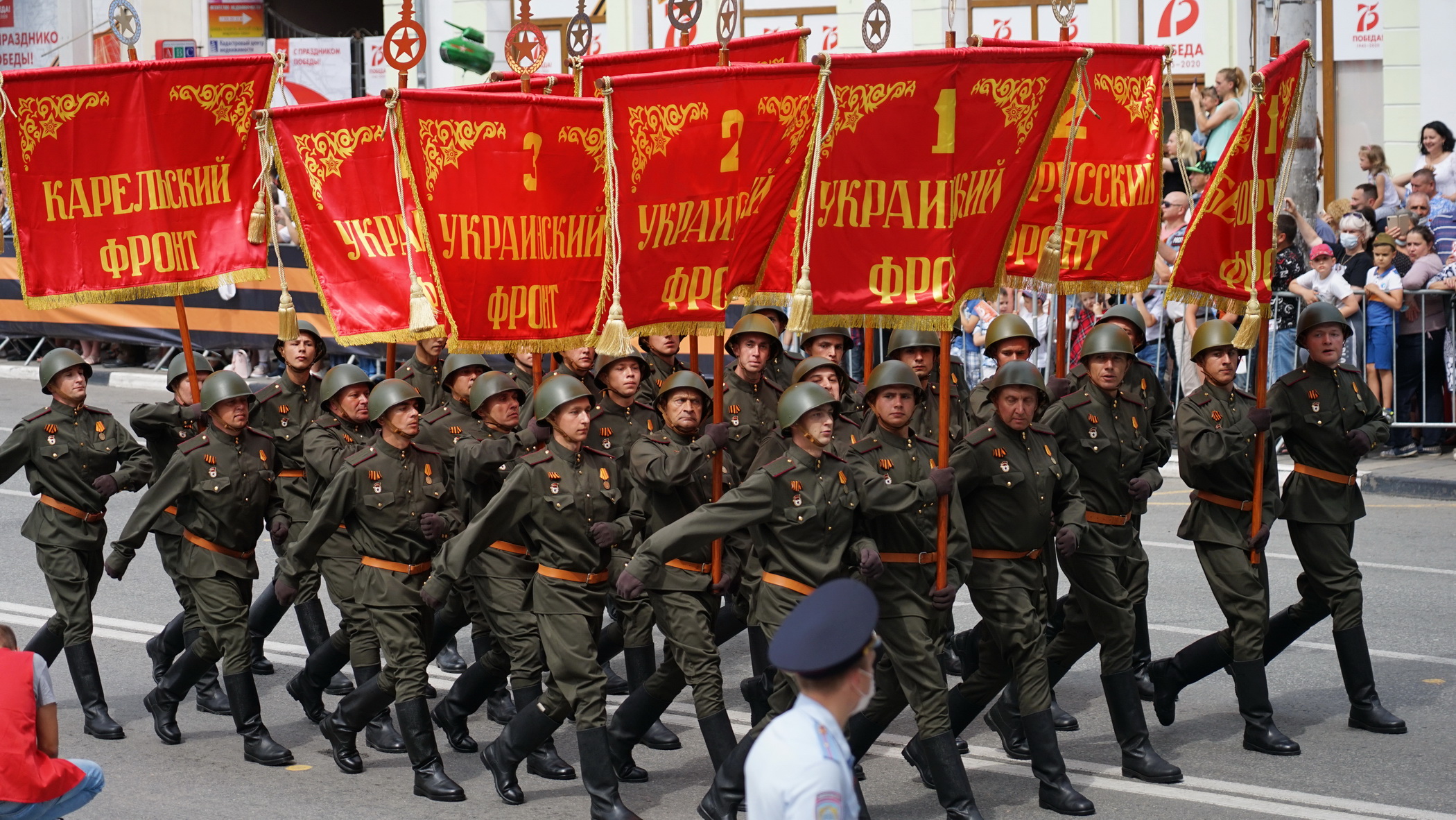 Перед началом парада зрители прошли термометрию. Им раздали защитные маски с флажками с надписью «75 победа!». Однако многие либо не надели маски, либо спускали их на подбородок.