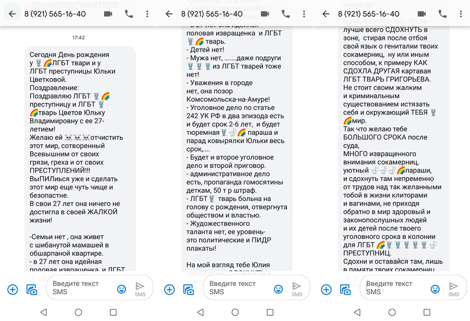 Она считает, что формальным поводом для преследования стало одно из заявлений петербургского активиста-гомофоба Тимура Булатова. Незадолго до возбуждения дела он на своей странице «ВКонтакте» выложил видеообращение с угрозами (сейчас оно недоступно): «Особый привет сучке из Комсомольска-на-Амуре. По тебе вообще все будет очень весело, тварь ты такая».
