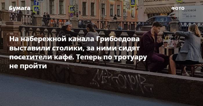 На набережной канала Грибоедова выставили столики, за которыми сидят посетители ближайших кафе. Прохожие не могут пройти по тротуару. Об этом «Бумаге» рассказала читательница.