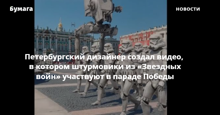Петербургский дизайнер Владислав Иванов опубликовал в своем инстаграме видео, на котором имперские штурмовики из киновселенной «Звездные войны» участвуют в параде Победы на Дворцовой площади. Работа называется «Имперские амбиции».