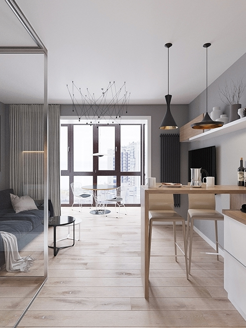 При этом в квартирах с обычными планировками проблема освещенности решается грамотным использованием искусственных источников света: торшеров, настольных ламп, гирлянд. Для того чтобы в комнату проникало как можно больше света дизайнеры советуют использовать светлый тюль или вовсе оставить окно открытым на скандинавский манер.