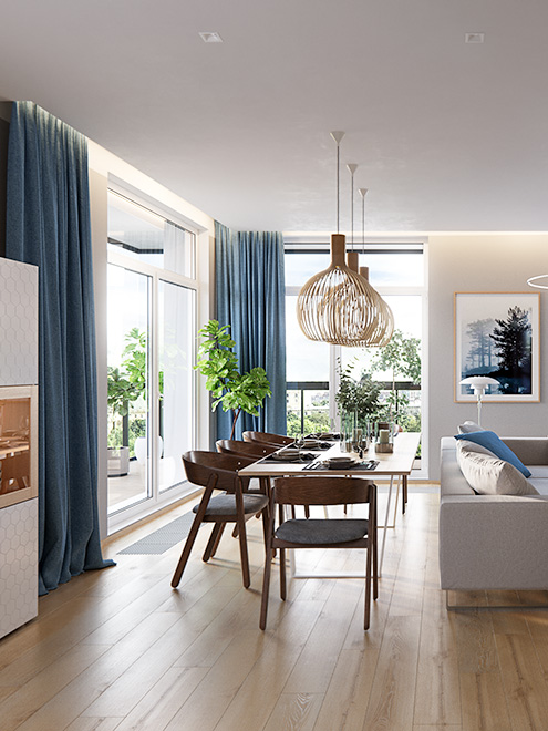 Одно из основных правил в дизайне помещения, где используется панорамный вид, — не загромождать пространство лишней мебелью и предметами. Выбор в пользу панорамных окон предусматривает свободу комнат и большое количество воздуха. Дизайнер интерьеров Олеся Голова говорит, что панорамное остекление — это самодостаточный элемент интерьера, и акцентом в такой комнате становится вид из окна.
