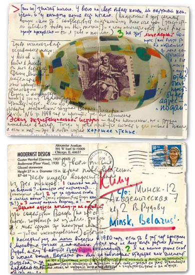 Открытка Киму от А. Асаркана из Чикаго Второй срок — в 1962 году — Ким Хадеев получает за хранение и распространение московского самиздата. Своего, минского, самиздата не могло быть в принципе: Ким настолько был под колпаком ГБ, что это бы сразу заметили (сексотов в его настежь открытом доме было достаточно). А неподцензурная публикация — это прямая статья и новая посадка. Поэтому все, что сочинялось в кругу Кима Хадеева, писалось до лучших времен — в стол.