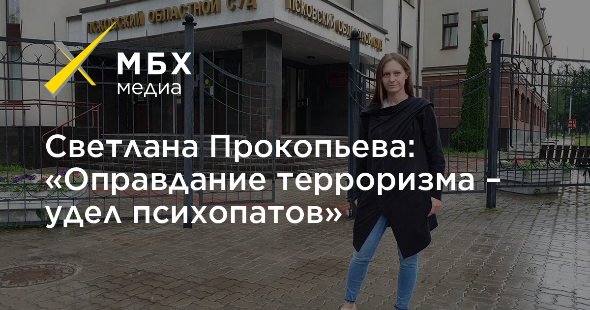 В Псковском областном суде проходит уже седьмое заседание Второго Западного окружного военного суда по делу Светланы Прокопьевой. Стороны уже представили все доказательства по делу, через два дня начнутся прения. Сегодня «МБХ медиа» публикует выдержки из стенограммы судебного допроса обвиняемой в оправдании терроризма журналистки за передачу о самоподрыве 17-летнего юноши в архангельском управлении ФСБ в октябре 2018.