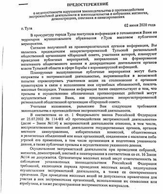 Предостережение 2 июня направили председателю «Народного совета» из-за информации о том, что организация якобы планирует проводить акции, направленные «на формирование негативного общественного мнения и дискредитацию деятельности органов власти Тульской области в сфере борьбы с коронавирусной инфекцией».