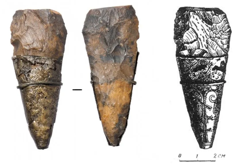Яркое свидетельство этому найдено в Новгороде. В экспозиции Новгородского музея можно увидеть обломок кремневого наконечника копья в медной оправе, на которой изображен восьмиконечный христианский крест. Этот необычный предмет был обнаружен на Неревском раскопе внутри остатков сруба, построенного после пожара 1311 года. Очевидно, сломавшийся наконечник копья (длиной 7,8 см) был выброшен еще в эпоху неолита, но потом был где-то найден средневековым новгородцем и использовался владельцем как амулет.
