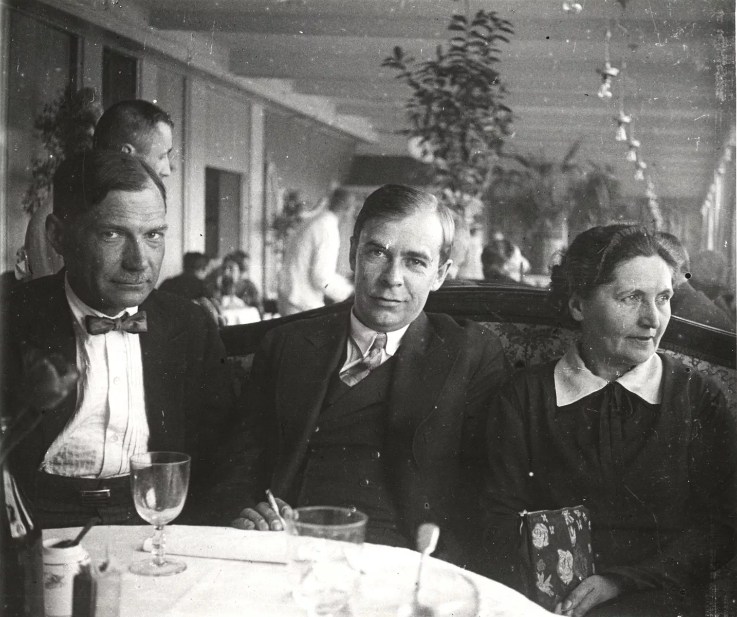 Евгений Замятин, Виктор Ключарев и Людмила Николаевна Замятина в ресторане в гостинице «Европейская». Ленинград, 1931 год
