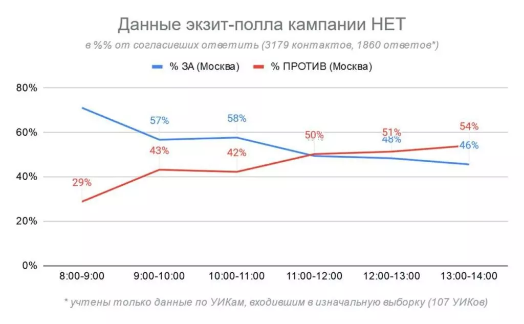 По данным экзитполов кампании «Нет!» на 14:30 (мск), в Москве за поправки проголосовали 51% граждан, против — 49%. В Петербурге изменение Конституции поддержали 44% проголосовавших, против выступили 56%.