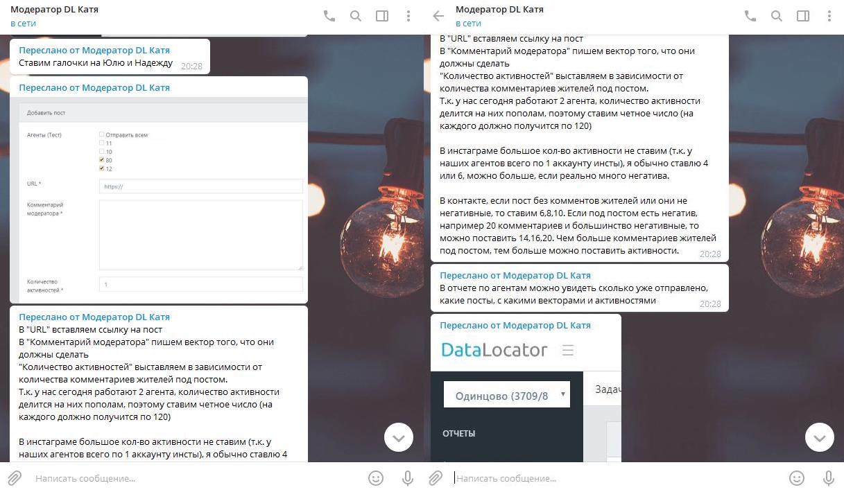 «В инстаграме у всех по одному комментарию; там написано в инструкции, что в инстаграме нагонять много нельзя, — рассказывает Дарья про особенности работы. — Комментарии приходят отовсюду вообще: из одноклассников, из твиттера, из телеграма даже приходят, если это открытые беседы. Приходит ерунда какая-то — по ключевому слову «Одинцово» или «Оди» все что угодно может прийти. В задания агентам идет то, что уже отобрали».