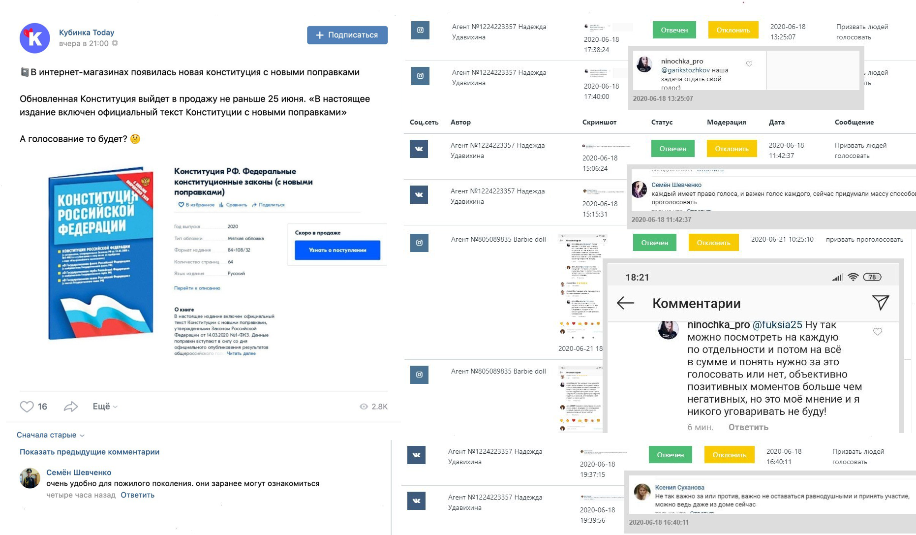 Примерно с 20-21 июня появилась тема общероссийского голосования, рассказывает Дарья. «Появлялись новости, посты, что вышла уже Конституция в интернет-магазине и как же так — надо было успокоить всех людей: ой как здорово, Конституция».