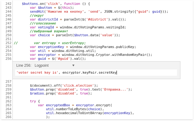 Для того чтобы сохранить генерируемый в браузере секретный ключ, мы в Google Chrome получили электронный бюллетень, открыли «Инструменты разработки», выбрали вкладку Sources, отыскали библиотеку election.js, нашли там строку с генерацией секретного и публичного ключей, поставили после нее logpoint (точка, дойдя до которой браузер запишет в консоль требуемую отладочную информацию): 'voter secret key is', encryptor.keyPair.secretKey. И только после этого проголосовали.