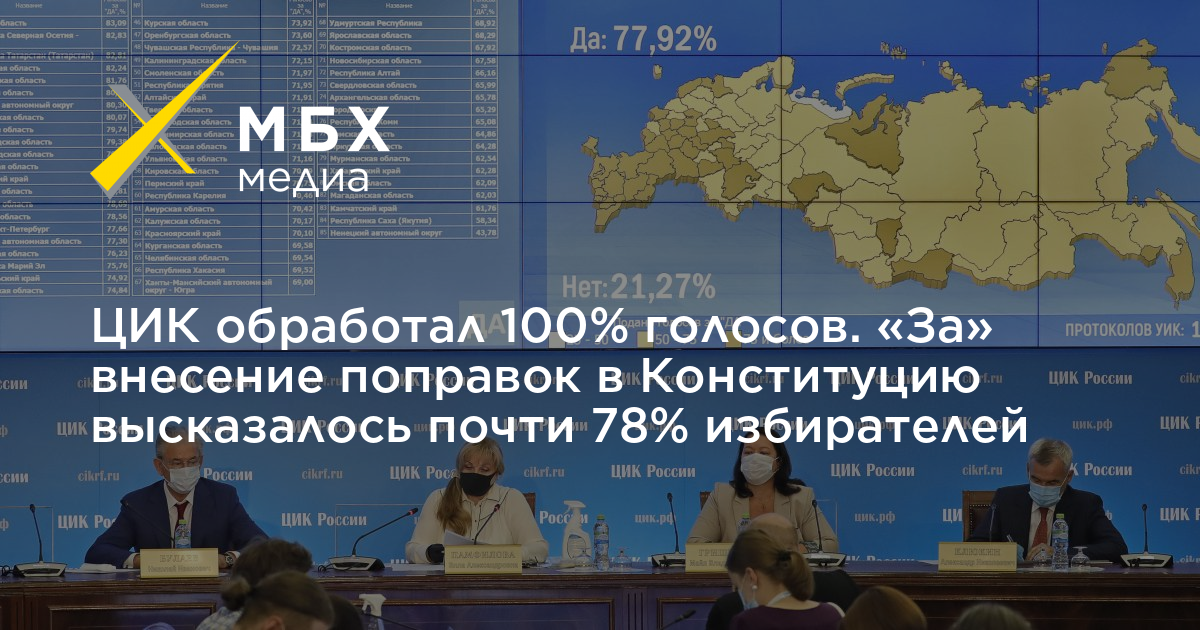 ЦИК обработал 100% голосов. «За» внесение поправок в Конституцию высказалось почти 78% избирателей