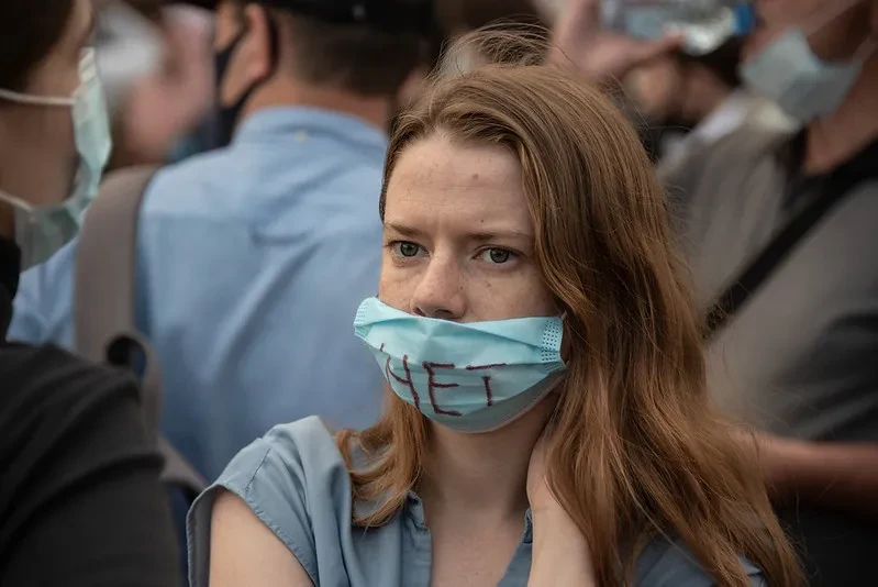 Даже сотрудники полиции ни разу не объявили в громкоговорители, что акция не согласована и что проходу других граждан кто-то мешает. Два одиноких автозака были спрятаны у кинотеатра «Россия», а у проезжей части дежурило всего несколько полицейских, причем за рамками. К людям сотрудники правопорядка вышли всего один раз, и то, чтобы совершить внешне очень заботливый жест — сотрудница полиции взяла в руки пачку одноразовых черных масок и раздала их собравшимся со словами «Уважаемые граждане, пожалуйста, соблюдайте социальную дистанцию». Не в громкоговоритель, тихо, игнорируя встречные вопросы о «внезапной заботе».
