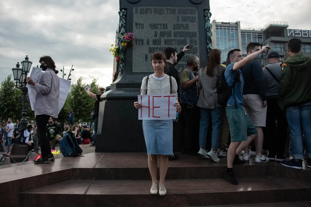 Вечером 1 июля, когда Центризбирком начал публиковать первые данные обработанных протоколов голосования по поправкам в Конституцию, на Пушкинскую площадь в Москве вышли несколько сотен человек — всего, по оценкам корреспондентов «Новой», около 400. Некоторые из них стояли с плакатами: «Закрутите гайки — вышибет дно», «Мозги им надо поменять, а не Конституцию», «Я говорю свое “нет” преступным поправкам». Люди очень редко что-то выкрикивали, в основном парами спокойно общались между собой, периодически вступали в словесные перепалки с провокаторами и не скрывали своего разочарования относительно количества пришедших. Пусть даже на созванную в тот же день акцию.