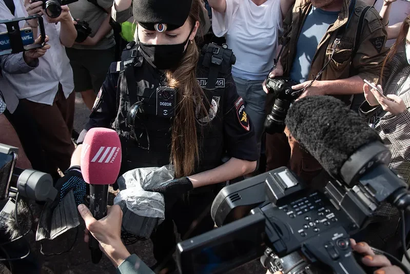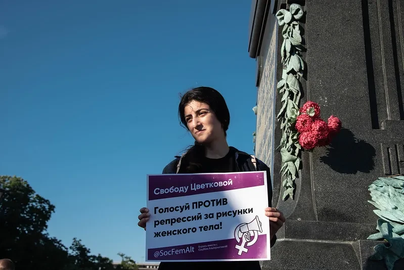 При этом девушка проходила между рядами плотно стоящих людей, между которыми не было даже метра. А еще пару дней назад в центре Москвы жестко задерживали десятки женщин, всего лишь вставших в одиночный пикет в защиту Юлии Цветковой.