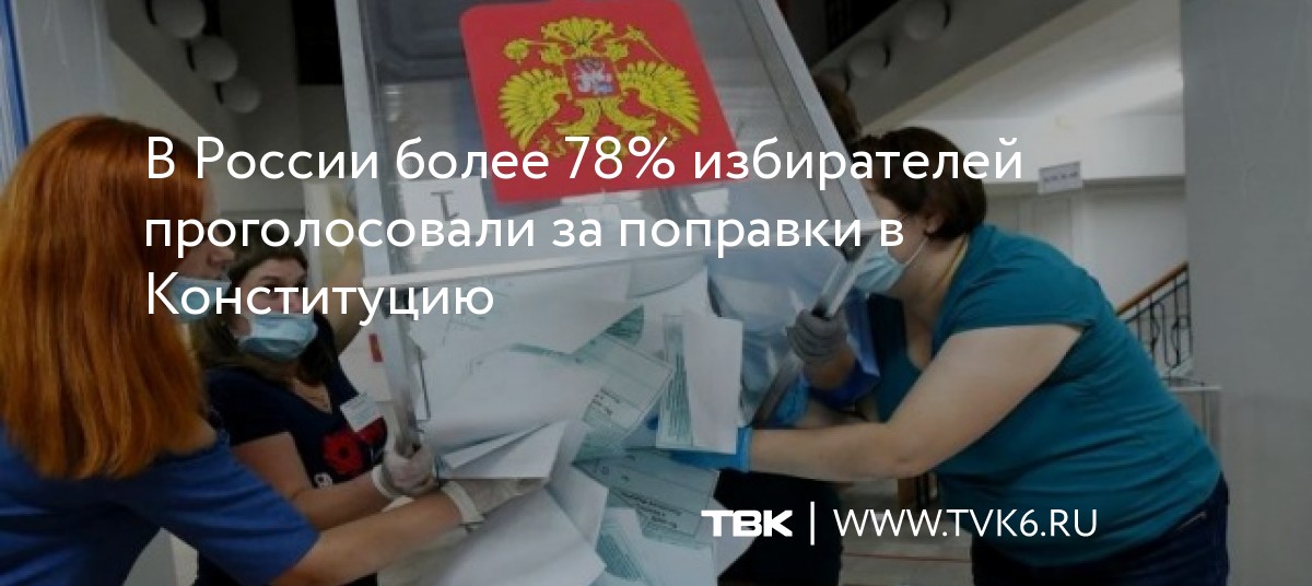 За поправки в Конституцию проголосовали 78,03% избирателей в России, против – 21,16%. Об этом сообщили ЦИК России после обработки 99,01% протоколов. Явка по стране составила около 65% по последним данным.
