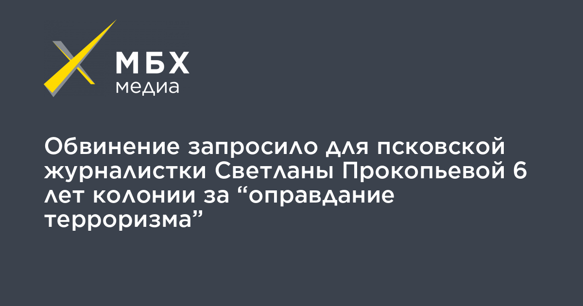 Обвинение запросило для псковской журналистки Светланы Прокопьевой 6 лет колонии и запрет на работу в журналистике на 4 года. Об этом сообщает корреспондент «МБХ медиа» и зала суда. По версии следствия, она должна понести такое наказание, поскольку «заведомо зная, что взрыв в Архангельске был терактом, формировала у массовой аудитории мнения о признании идеологии и практики терроризма правильной».
