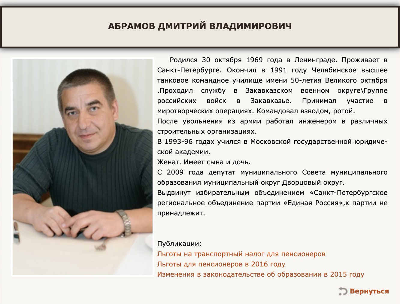 На видеозаписи нападения на Давида Френкеля, кроме сотрудников полиции, есть еще один участник конфликта: бывший глава Дворцового муниципального округа Петербурга Дмитрий Абрамов. «Медиазона» решила разобраться, что этот человек делал на избирательном участке, и выяснила, что он несколько дней активно противодействовал работе независимых наблюдателей, а также восстановила его политическую и криминальную биографию.