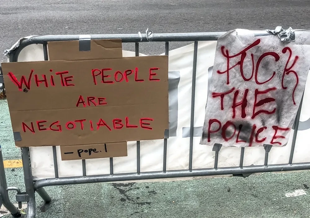 Автономная свободная от полиции зона Нью Йорка рядом с городской мэрией и недалеко от Бруклинского моста.Реакция на камеру внутри зоны не очень хорошая. Фото: Дмитрий Бухонко-Крошицкий, специально для «Новой»Главный призыв — отобрать у полиции финансирование. К президенту тоже есть вопросы. Фото: Дмитрий Бухонко-Крошицкий, специально для «Новой»«Расизм и капитализм идут рука об руку». Фото: Дмитрий Бухонко-Крошицкий, специально для «Новой»Старый лозунг ACAB. Фото: Дмитрий Бухонко-Крошицкий, специально для «Новой»Цитата американского художника Поупа Эла «С белыми можно договориться». Фото: Дмитрий Бухонко-Крошицкий, специально для «Новой»Девушка возле плаката с именем погибшего Джорджа Флойда. Фото: Дмитрий Бухонко-Крошицкий, специально для «Новой»«Марксистские феминистки за аболиционизм (отмену полиции)». Фото: Дмитрий Бухонко-Крошицкий, специально для «Новой»Всегда открытый парк рядом с автономной зоной закрыт. Впрочем, полицейские здесь очень доброжелательные. Фото: Дмитрий Бухонко-Крошицкий, специально для «Новой»Метро в зоне не работает. Фото: Дмитрий Бухонко-Крошицкий, специально для «Новой»«Отдел по делам искусств». Основная задача — рисовать плакаты. Фото: Дмитрий Бухонко-Крошицкий, специально для «Новой»Еда довольно разнообразная, и выпечка, и фрукты, разные этнические блюда тоже. И все без ограничений, сколько хочешь. Фото: Дмитрий Бухонко-Крошицкий, специально для «Новой»Спальная зона. Фото: Дмитрий Бухонко-Крошицкий, специально для «Новой»