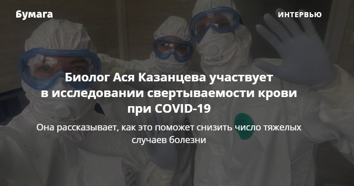 Научный журналист и биолог Ася Казанцева с начала мая принимает участие в исследовании свертываемости крови при коронавирусе. Ученые хотят выяснить, как снизить число тяжелых случаев COVID-19.