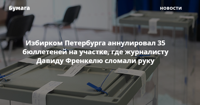 Избирком аннулировал 35 бюллетеней из переносного ящика на участке № 2191, где сломали руку журналисту Давиду Френкелю. Об этом заявил руководитель юридического управления избирательной комиссии Олег Зацепа.