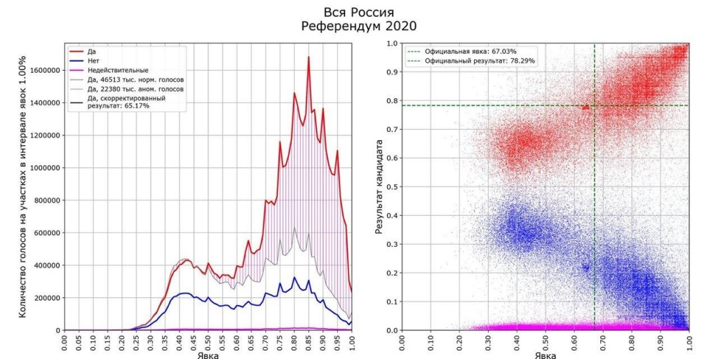 «У нас есть кластер участков, где явка была около 42% и результат 65% — за, 35% — против. И этот кластер выглядит совершенно натурально, — цитирует Шпилькина Znak.com. — В этот кластер попадают участки из разных регионов — от Хабаровского края до Архангельской области, там же есть участки из Екатеринбурга и Москвы. И наоборот, второй кластер — с явкой примерно от 60% и результатом „да“ выше 70% — несет на себе характерные следы фальсификации данных, например, аномальное количество участков с красивыми явками и результатами».