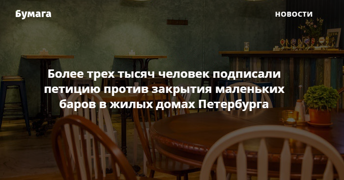 На сайте Change.org опубликовали обращение к губернатору Петербурга Александру Беглову с просьбой разрешить работу маленьких баров в жилых домах Петербурга. К вечеру 4 июля петицию подписали почти 3,5 тысячи человек.