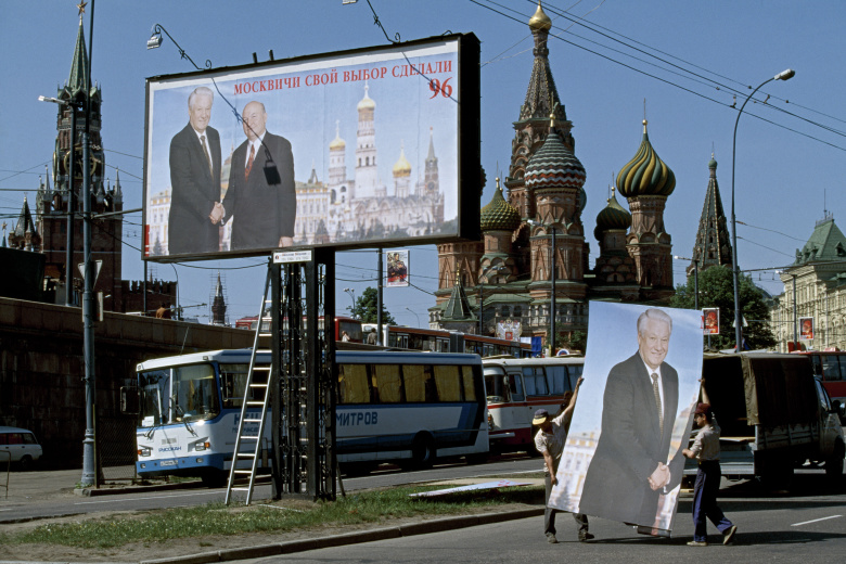 Рабочие вешают предвыборные плакаты с изображением Бориса Ельцина напротив Красной площади. Москва, Россия, 1996