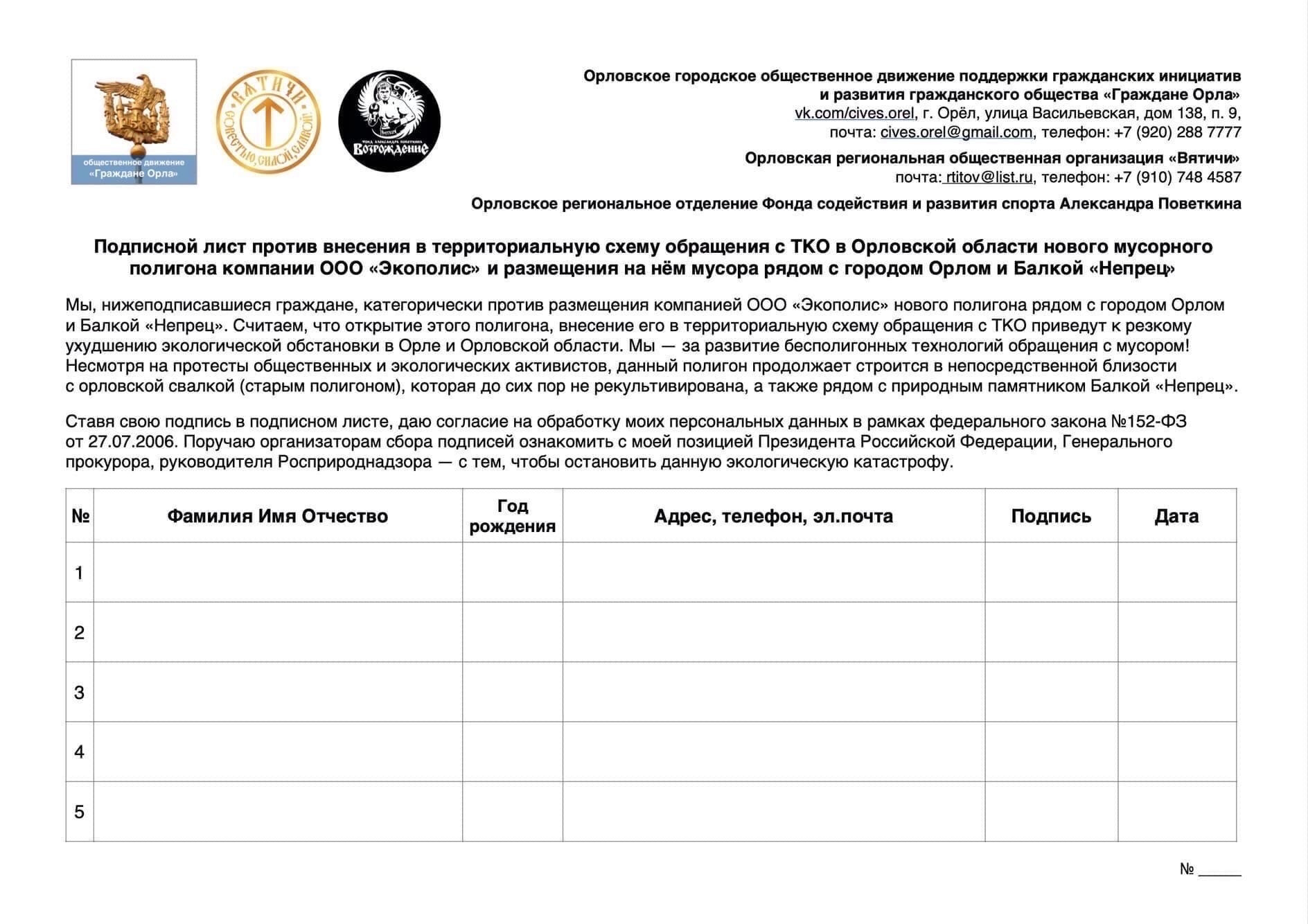 Мы ведем сбор подписей против открытия полигона. Граждане Орла, нам важна ваша поддержка. Выходите на связь, подписывайте обращение, включайтесь в реальный общественный и политический процесс — наши интересы защитить сможем только мы сами!
