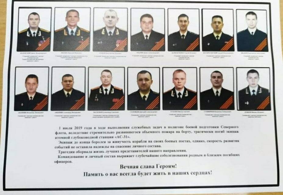 Пожар на подводном аппарате в Баренцевом море произошёл 1 июля. Основной версией случившегося в Министерстве обороны назвали возгорание в аккумуляторном отсеке. Погибли 14 старших офицеров, все они были награждены посмертно, двое — званиями Героя России.