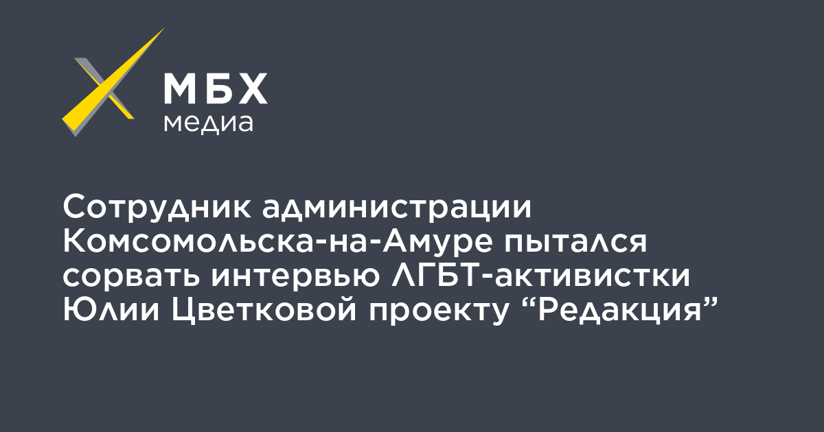 В Комсомольске-на-Амуре человек, представившийся работником администрации города, ворвался в помещение, в котором проходило интервью ЛГБТ-активистки Юлии Цветковой проекту «Редакция». Об этом сама Цветкова сообщила «МБХ медиа».