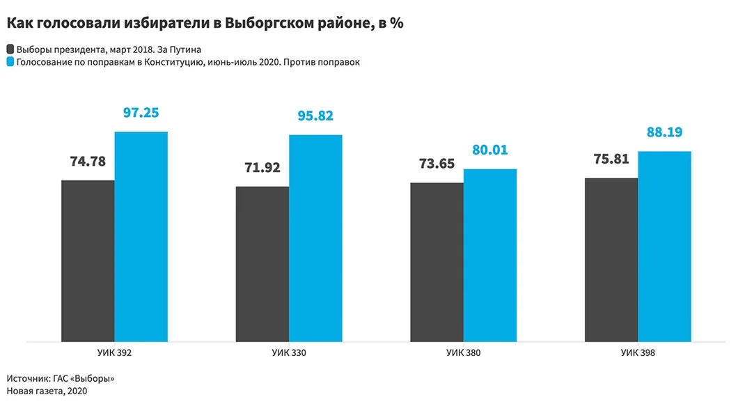 Но, согласно ГАС «Выборы», в некоторых избиркомах большинство высказалось против поправок. В Выборгском районе в этом смысле отличились 18 участков (ТИКи 10, 14 и 22). Разброс протеста от 59,46% на УИК №406 в больнице №122 (перепрофилирована под COVID) до рекордных по городу 97,25% на УИК №392 в гимназии №73 на проспекте Энгельса.