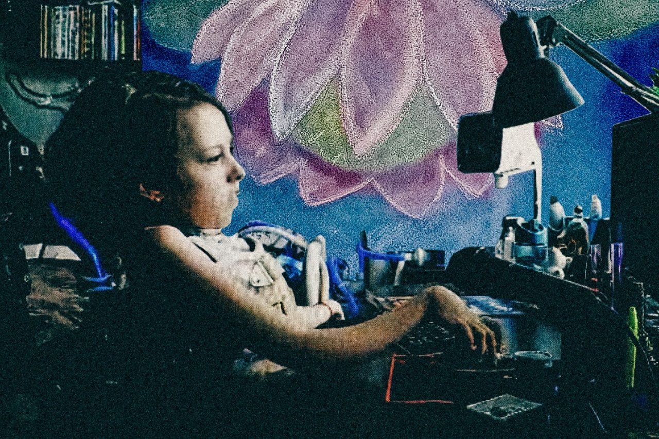 Полина сидит за столом в комнате. Над ней — новогодняя гирлянда и наклеенное на потолок звездное небо, вокруг — полки с книгами и коллекция ангелов, перед ней — компьютер с запущенной игрой «Майнкрафт», телефон с чатами в вайбере и стакан с коктейлем. Полина пьет его уже два часа, но стакан все еще наполовину полон. Полине нужно специальное питание, обычную еду она не усваивает. Девочка говорит, что коктейль со вкусом банана.