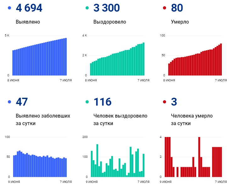 Всего в России на данный момент количество зараженных коронавирусом составляет 694 230 человек (за сутки — 6 368). Из них 463 880 человек выздоровели (за сутки — 9 551), а 10 494 человек умерли (за сутки — 198).