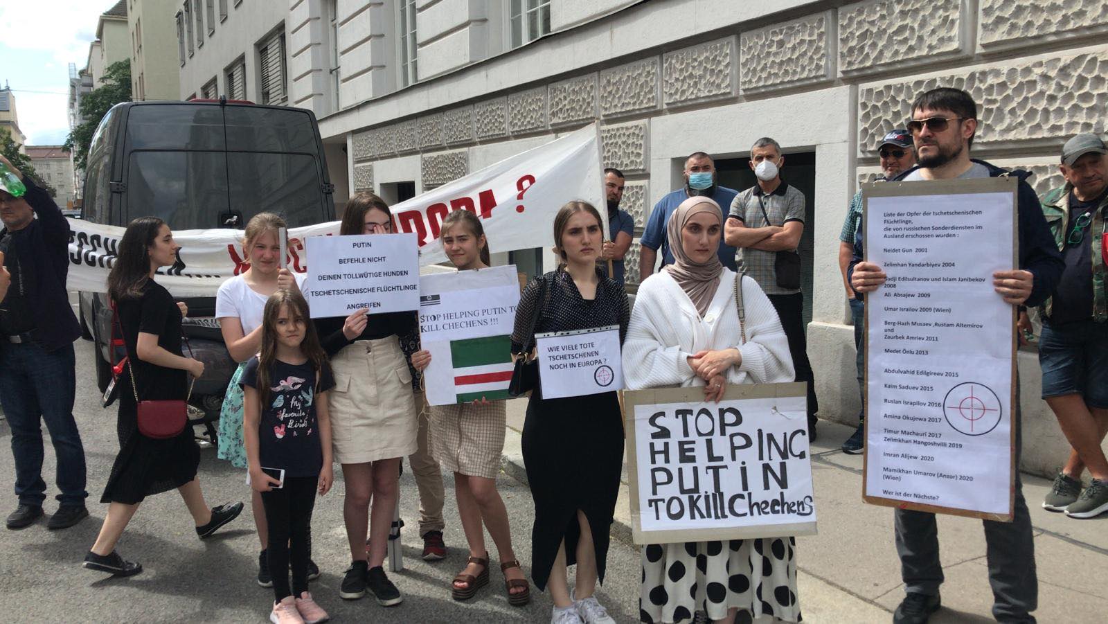 Перед зданием российского посольства в Вене прошла акция протеста против убийств в Европе выходцев из Чечни. Ей предшествовала гибель чеченского политэмигранта Мамихана Умарова.