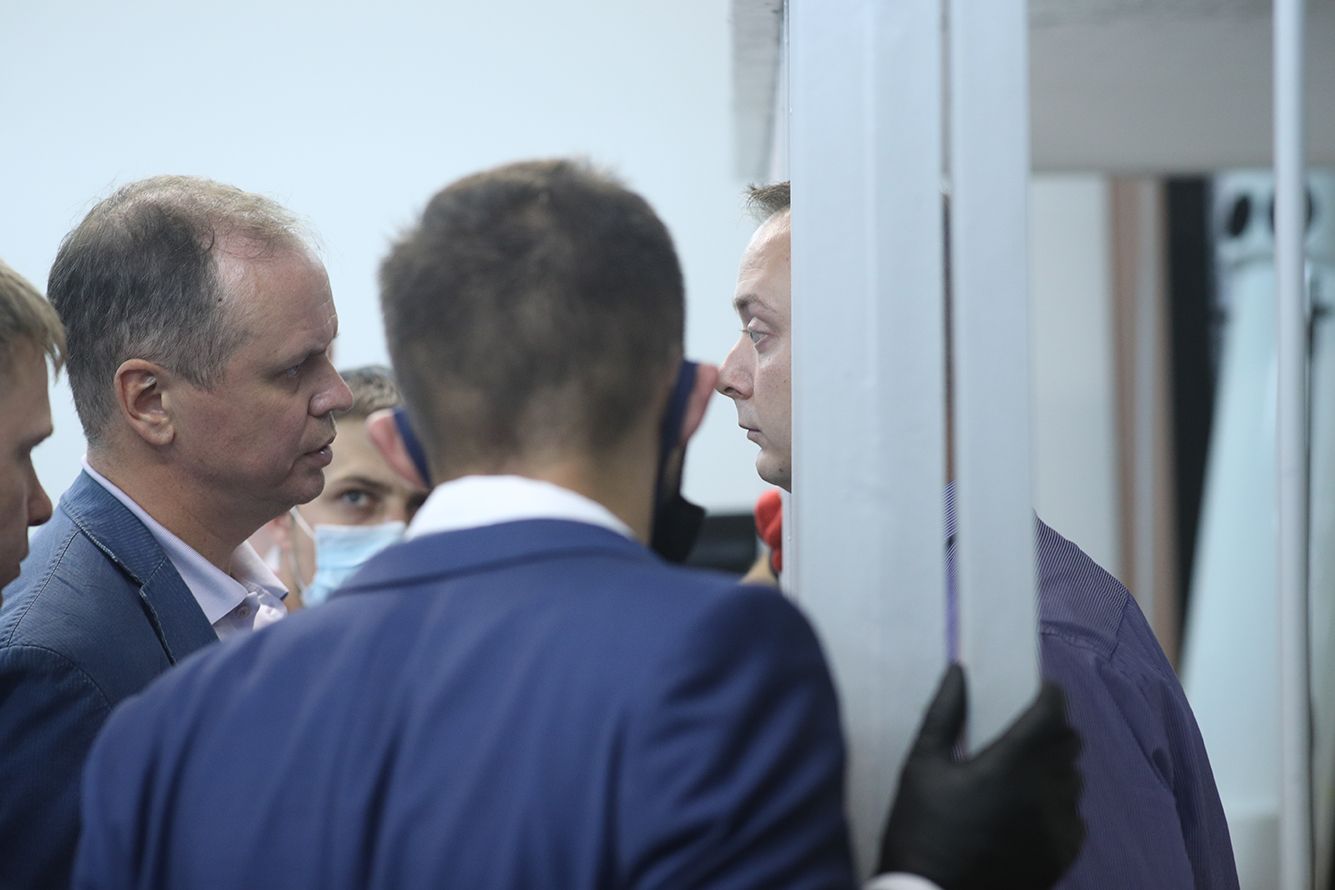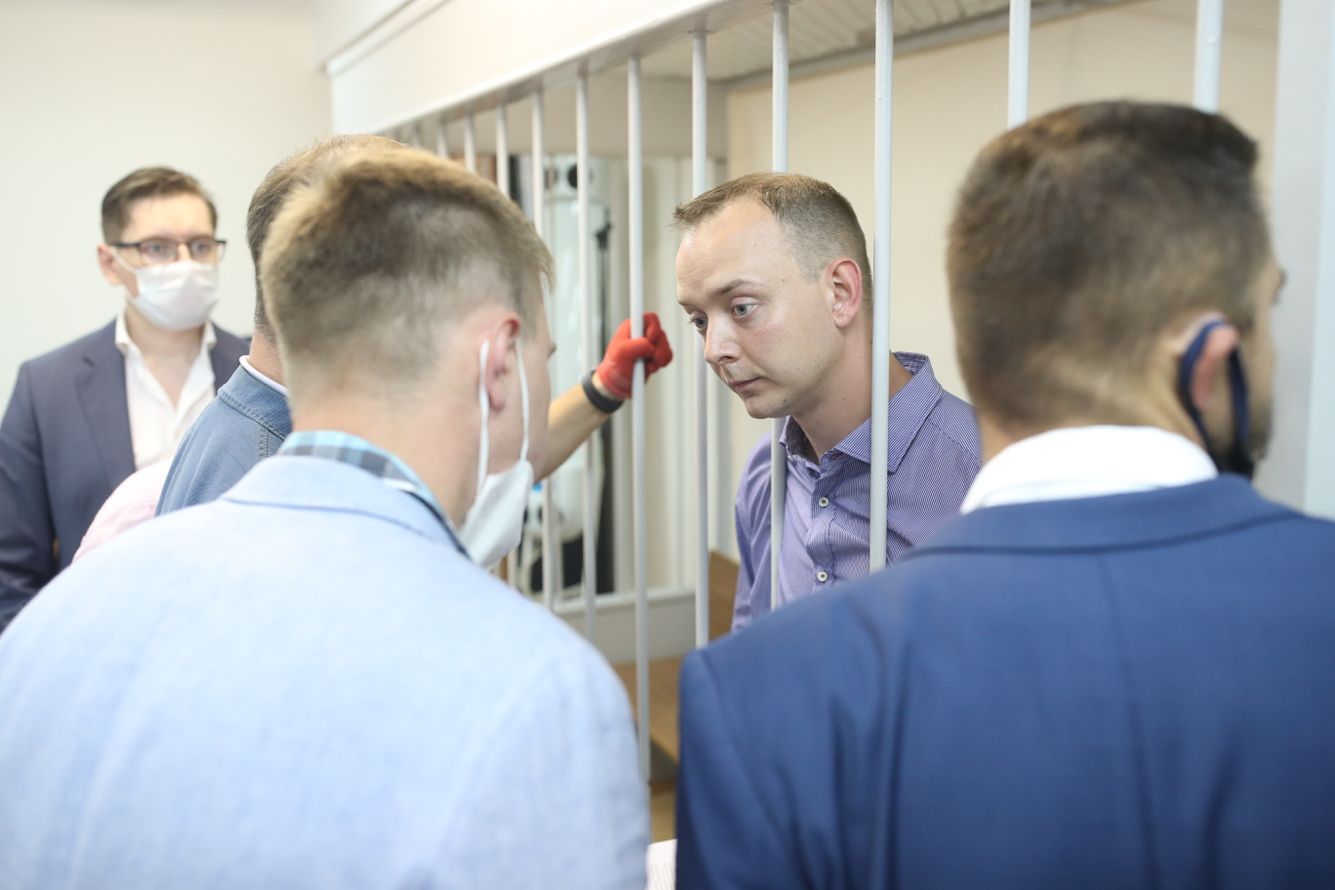 Before the hearing begins, the Lefortovo District Court’s press service allows photographers and camera operators to record images of Safronov in the courtroom. The room is small and other correspondents are then admitted in turns. From inside his box, Safronov nods at his old colleagues and confers with his lawyers.