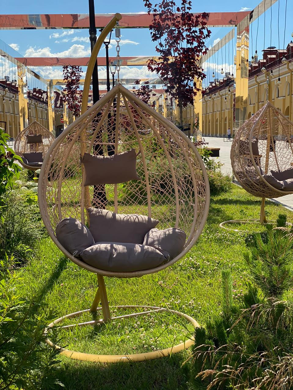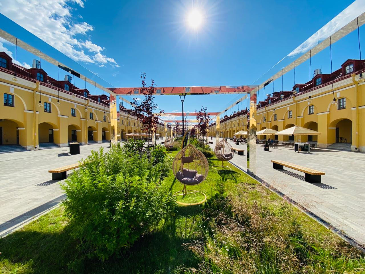 На территории двора установили скамейки и качели-коконы. Расположенный в здании ресторан сети Hard Rock Cafe разместил во дворе летнюю террасу, которая начинает работать 9 июля.