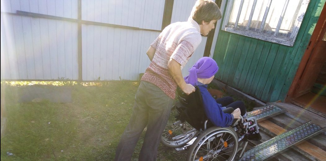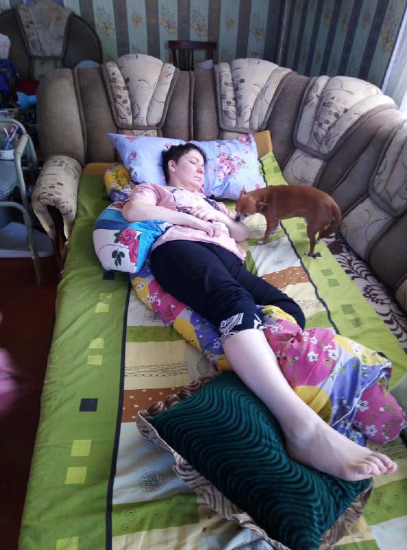 Оксана уже мало что может сама. Она живет со своей мамой в маленьком городе Ишим в Тюменской области. Мама — пожилая женщина, которая тоже передвигается на коляске после ампутации ноги, но как может ухаживает за дочерью. Четыре года назад у Оксаны внезапно умер муж, и вскоре после этого она заболела. У Оксаны есть дочь, она давно не общается с родными.