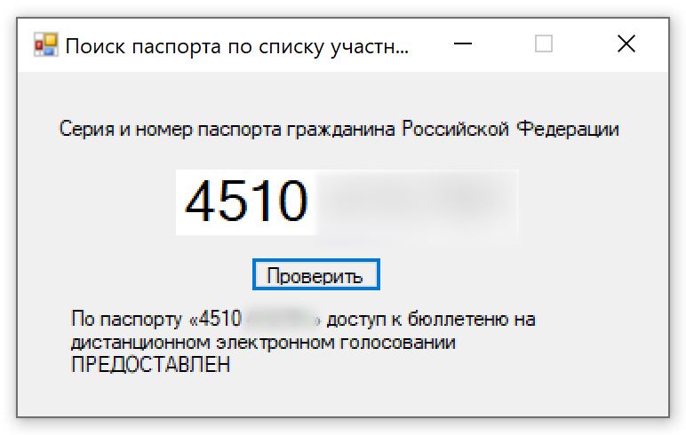 Программа для проверки интернет-избирателей представлена в виде небольшого исполняемого файла degvoter.exe. Она предлагает ввести серию и номер паспорта гражданина России — после чего сообщает, был ли предоставлен человеку с этим паспортом «доступ к бюллетеню на дистанционном электронном голосовании» или нет. Если попробовать ввести случайные серию и номер, скорее всего, вам сообщат, что этот паспорт не найден «в списке участников дистанционного голосования».