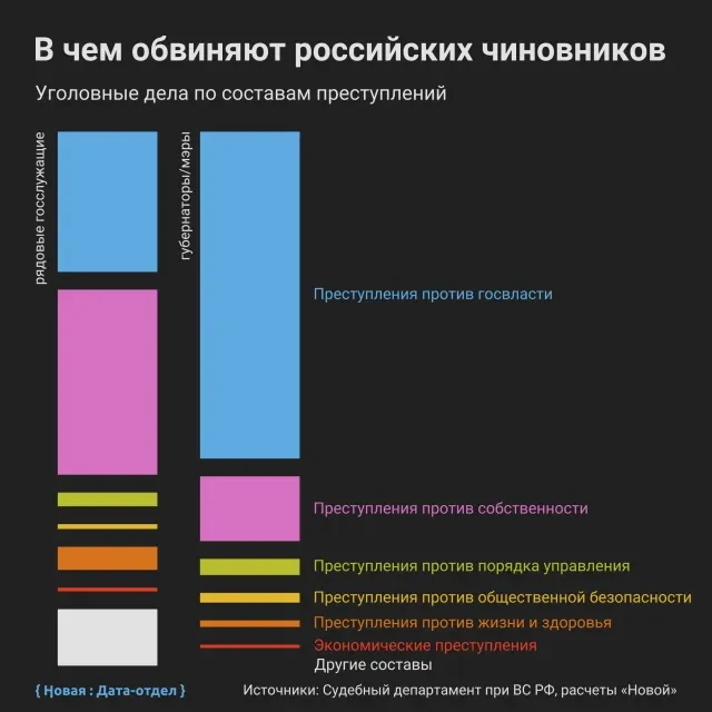 Чаще всего рядовых чиновников обвиняют в преступлениях против собственности — мошенничестве, вымогательстве, кражах и хищении (43,3% уголовных дел). Самая популярная глава среди губернаторов и мэров — преступления против госвласти — здесь оказалась на втором месте (32,8%). За ней идут преступления против жизни и здоровья — убийство, побои и истязания (5,4%). За шесть лет за убийство были осуждены 128 чиновников: обычные госслужащие совершают подобные преступления чаще, несмотря на то, что для губернаторов такое обвинение — редкость.