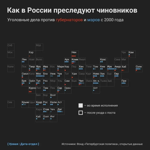 «Новая» проанализировала уголовные дела, возбужденные против губернаторов и мэров с 2000 года. За это время под следствием оказались по меньшей мере 102 мэра и 30 губернаторов из 53 субъектов РФ.